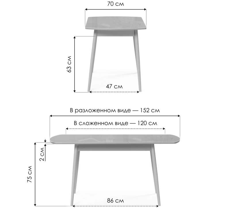 Расстояние между ножками: 86 - 47 см. Толщина столешницы: 2 см.
